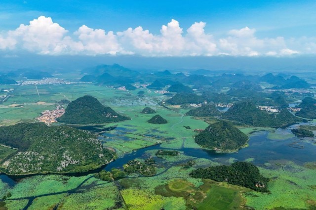 7月16日拍攝的普者黑景區(qū)風(fēng)光(無(wú)人機(jī)照片)。新華社記者 彭奕凱 攝