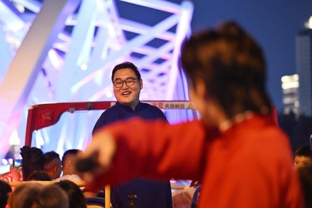 “相聲巴士”的定制化夜間游覽線路,將古文化街、鼓樓、意式風(fēng)情區(qū)、解放橋、天津站世紀(jì)鐘、津?yàn)硰V場(chǎng)、望海樓、“天津之眼”摩天輪等20余處地標(biāo)景點(diǎn)串聯(lián)成線。演員在途中結(jié)合景點(diǎn)進(jìn)行講解,讓觀眾除了能享受海河兩岸夜景和沉浸式津味相聲外,還能深入了解天津歷史,品味天津特色文化。