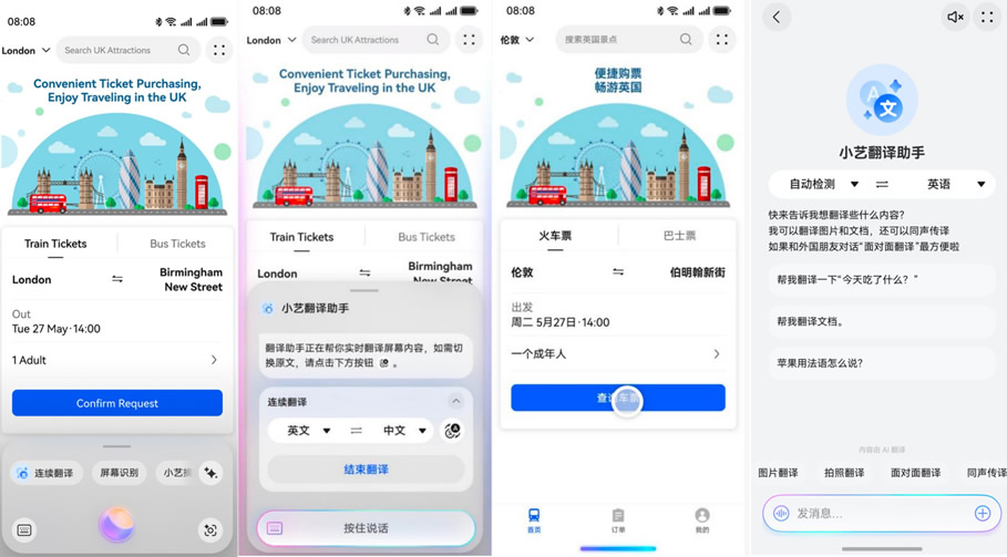 當(dāng)然,小藝的能力遠(yuǎn)不止于此。海外出行時,用戶翻閱外文網(wǎng)站或使用外文App,只需長按屏幕底部小藝導(dǎo)航條,點擊“連續(xù)翻譯”,或直接喚醒小藝后說“連續(xù)翻譯”,即可體驗邊瀏覽邊翻譯的效果。當(dāng)需要與外國友人進行面對面溝通時,使用小藝的面對面翻譯幫你輕松應(yīng)對跨語言溝通場景;遇見不認(rèn)識的外文路牌、菜單,拍照發(fā)給小藝翻譯助手秒翻譯。