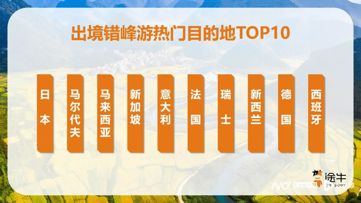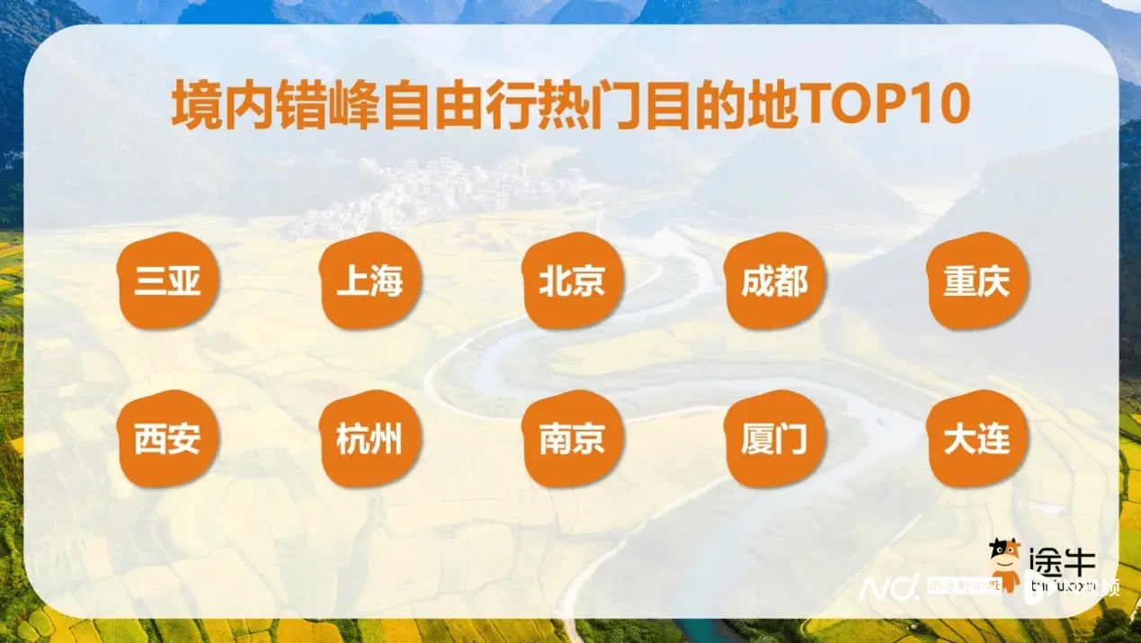 境內(nèi)錯(cuò)峰游仍是多數(shù)游客的首選,途牛平臺(tái)上境內(nèi)出游人次占比超過(guò)70%。熱門(mén)目的地包括上海、北京、三亞、成都、廣州、杭州、西安、南京、重慶、黃山等地。
