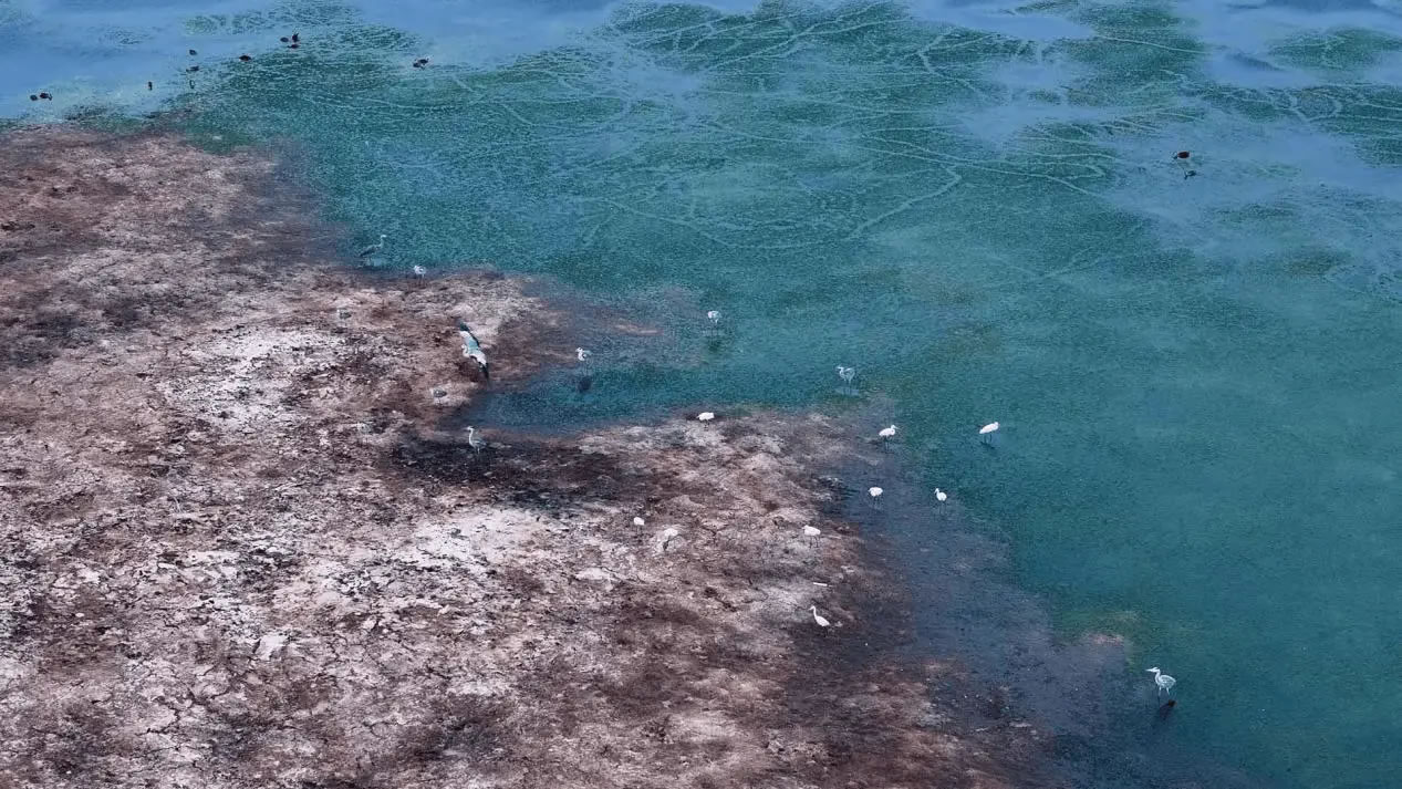 陽光灑落時,湖水清澈見底,魚兒在水中自在游弋,與岸邊景致構成絕佳畫面。此外,黑翅長腳鷸也不時現(xiàn)身灘涂,為這幅生態(tài)圖景再添一抹靈動色彩。