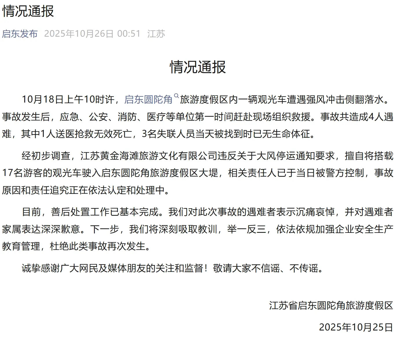該通報稱,10月18日上午10時許,啟東圓陀角旅游度假區(qū)內一輛觀光車遭遇強風沖擊側翻落水。事故發(fā)生后,應急、公安、消防、醫(yī)療等單位第一時間趕赴現(xiàn)場組織救援。事故共造成4人遇難,其中1人送醫(yī)搶救無效死亡,3名失聯(lián)人員當天被找到時已無生命體征。
