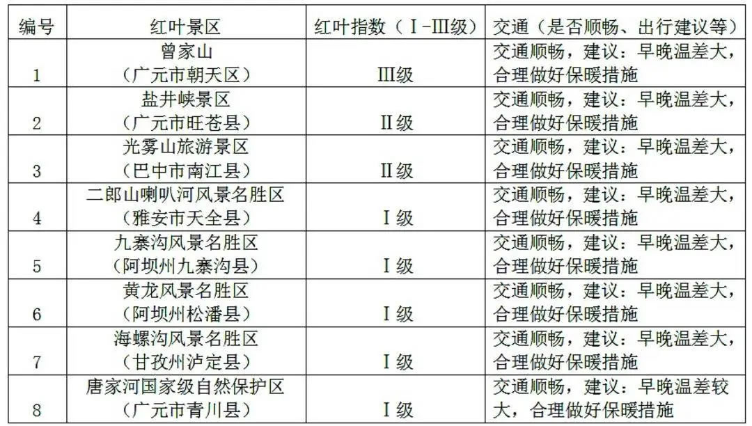 值得一提的是,近期較適宜觀賞紅葉的景點(diǎn)主要分布在四川省東北部曾家山、鹽井峽、光霧山景區(qū)。但今年受閏月和氣候等因素影響,預(yù)計(jì)紅葉觀賞期較往年推遲10~15天。