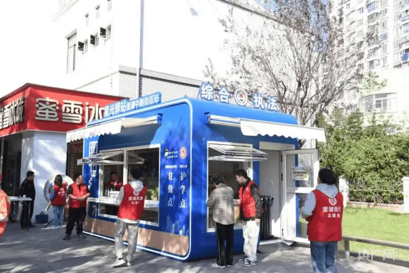 作為街區(qū)重要的“便民樞紐”,星光驛站功能定位清晰明確:面向戶外勞動者,這里是一座“能量補(bǔ)給站”,免費(fèi)提供飲水、熱飯、充電等基礎(chǔ)服務(wù),驅(qū)散奔忙的疲憊;對于周邊居民,它是一處“暖心港灣”,常態(tài)化開展義診、義剪等志愿服務(wù),讓便利直達(dá)身邊;針對沿街商戶,驛站則是一個(gè)“助力平臺”,及時(shí)更新政策手冊、提供證照辦理咨詢,助力經(jīng)營發(fā)展。