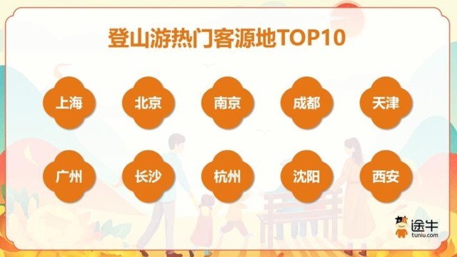 《報(bào)告》數(shù)據(jù)顯示,二線及以上城市用戶是登山游的主力軍,在今年途牛登山游用戶中的出游人次占比超過了70%。其中,上海、北京、南京、成都、天津、廣州、長(zhǎng)沙、杭州、沈陽(yáng)、西安等是排名靠前的客源地城市。