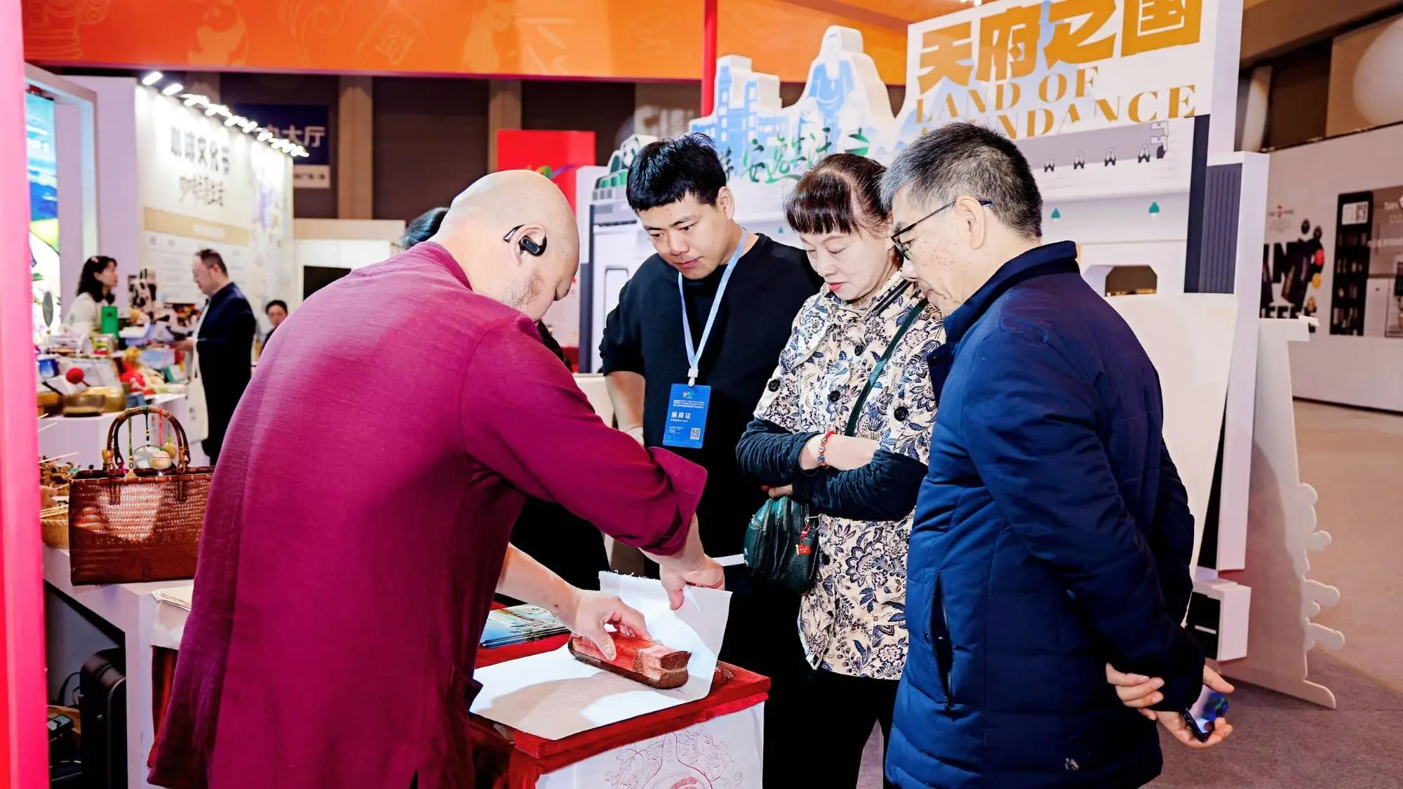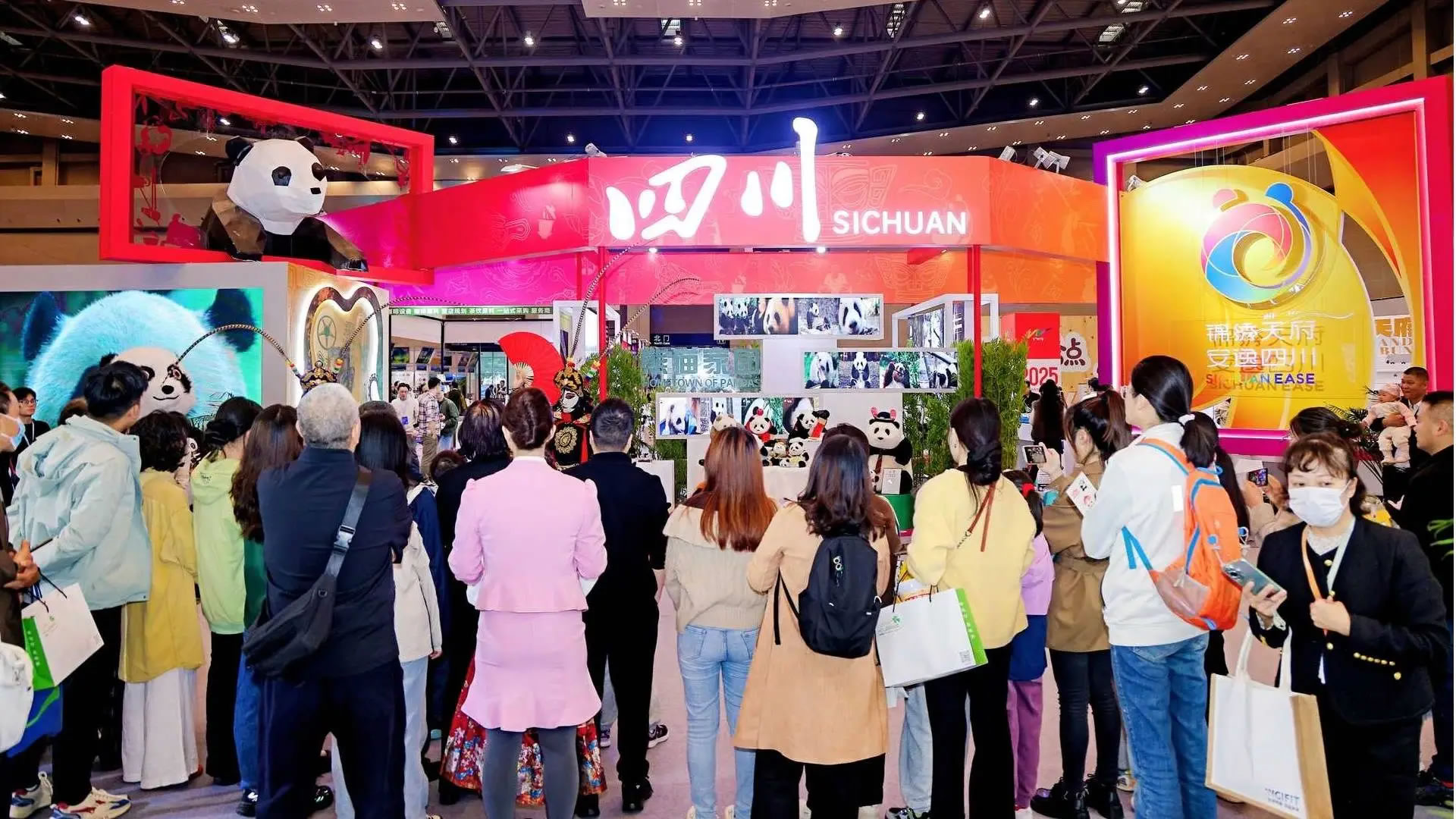 本次四川展臺位于展會核心區(qū)域,圍繞熊貓家園、古蜀文明、世界級旅游風景道等主題打造展區(qū),F(xiàn)場不僅有諸葛羽扇綸巾杯套組等文創(chuàng)產(chǎn)品、缽缽雞等天府美食展示,宜賓面塑、長寧竹編等非遺活態(tài)體驗,還通過川劇變臉表演、“安逸熊貓”人偶巡游營造沉浸式氛圍。同時,線下文旅咨詢區(qū)提供線路與政策解讀,百萬粉絲達人巡館直播、“安逸直播間”系列活動同步開展,實現(xiàn)“線下體驗+線上云看展”雙向聯(lián)動。