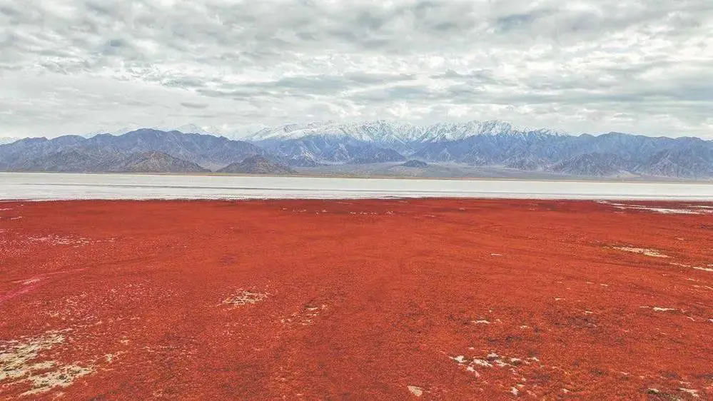 入秋后,海西蒙古族藏族自治州烏蘭縣的都蘭湖國(guó)家濕地公園,連片的鹽生植物鹽爪爪迎來最佳觀賞期。從高空俯瞰,宛如巨大的紅地毯鋪在都蘭湖畔,美不勝收,甚為壯觀。