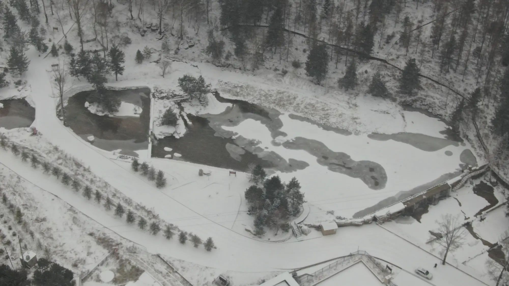 溪流與瀑布是雪中最靈動(dòng)的景致。十里清溪在皚皚白雪間蜿蜒,水面蒸騰的薄霧與雪氣交融,讓溪流似隱似現(xiàn),宛如銀綢纏繞山間。小型瀑布部分凝結(jié)成冰,晶瑩的冰掛與流動(dòng)的溪水相映成趣,水珠滴落時(shí)濺起的水花沾在石上,瞬間凝成冰晶,構(gòu)成動(dòng)靜結(jié)合的畫面。溪邊的苔石被積雪覆蓋,只露出邊緣的青黑,與白雪形成強(qiáng)烈對比。