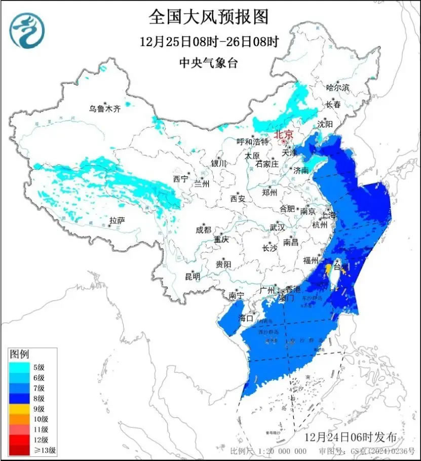 中央氣象臺今晨繼續(xù)發(fā)布大風(fēng)藍(lán)色預(yù)警:今天,西藏中西部、青海南部、內(nèi)蒙古中東部、河北北部、遼寧西部和遼東半島、山東半島等地有5~6級風(fēng),陣風(fēng)7~8級;渤海、渤海海峽、黃海、東海、臺灣海峽、臺灣以東洋面、巴士海峽、南海大部海域、北部灣將有7~8級、陣風(fēng)9~10級的大風(fēng),其中,臺灣海峽、臺灣以東洋面、巴士海峽部分海域風(fēng)力可達(dá)9級、陣風(fēng)10~11級。