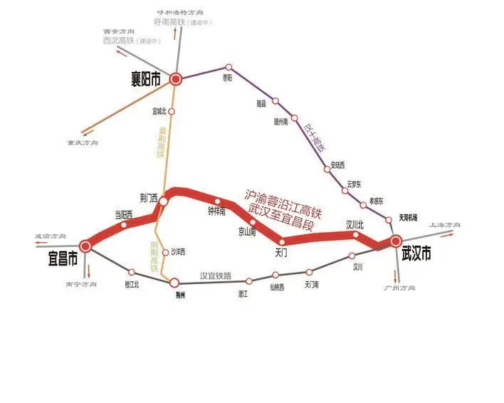 滬渝蓉高鐵武宜段位于湖北省境內(nèi),起自武漢市,經(jīng)天門市、荊門市,終至宜昌市。線路正線全長(zhǎng)314公里,設(shè)計(jì)時(shí)速350公里。開通后,宜昌至武漢的鐵路旅行時(shí)間將從目前的2小時(shí)大幅壓縮至最快1小時(shí)09分。