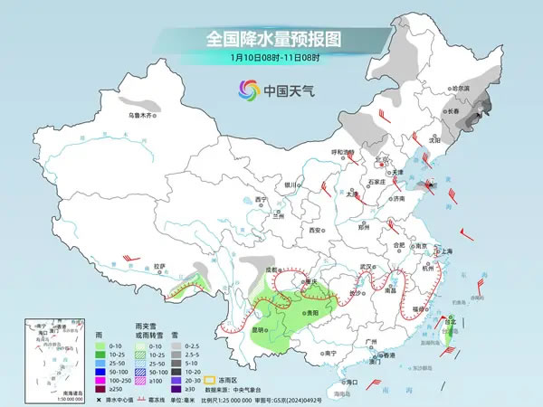這次冷空氣南下過程中,帶來的雨雪天氣并不多,主要在內(nèi)蒙古中東部、東北一帶。監(jiān)測(cè)顯示,9日8時(shí)至10日6時(shí),內(nèi)蒙古中東部、遼寧、吉林、黑龍江東部、河北北部、山西北部等地出現(xiàn)小到中雪或雨夾雪,內(nèi)蒙古東南部、遼寧中東部、吉林東南部部分地區(qū)現(xiàn)大到暴雪。