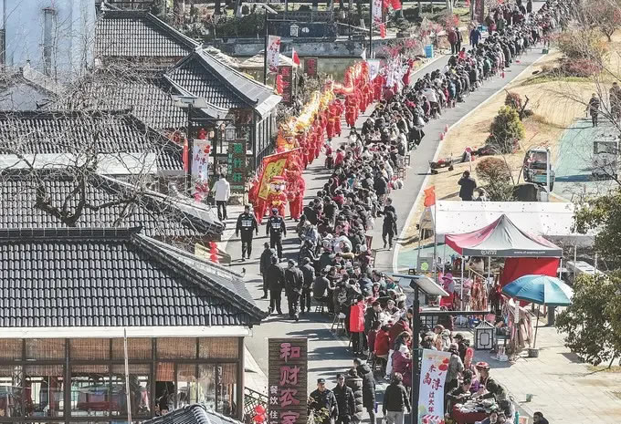 長街宴不僅是味蕾的盛宴,更是一場傳統(tǒng)文化的嘉年華。與美食相伴的是氣勢如虹的舞龍隊、古樸熱鬧的中馬燈巡游、精彩的舞獅表演,在大山村,殺年豬的傳統(tǒng)儀式、虎虎生風(fēng)的少兒武術(shù)、靈動活潑的小馬燈、喜慶昂揚(yáng)的舞蹈等節(jié)目輪番上演,生動呈現(xiàn)了高淳非遺民俗的獨特魅力。