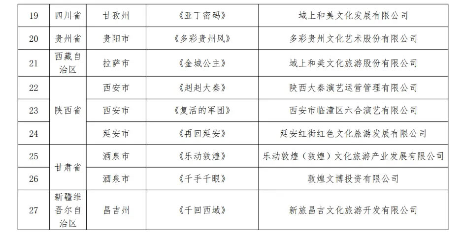 央廣網(wǎng)北京1月16日消息(記者 宋雪)文化和旅游部辦公廳近日發(fā)布通知,公布第二批全國(guó)旅游演藝精品名錄入選項(xiàng)目名單,《只有紅樓夢(mèng)·戲劇幻城》《赳赳大秦》《樂(lè)動(dòng)敦煌》等27個(gè)項(xiàng)目入選。