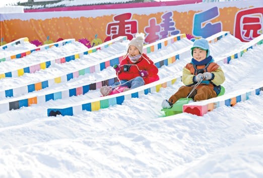 龍?zhí)豆珗@冰雪節(jié)雪橇樂園吸引小朋友來體驗(yàn)。
