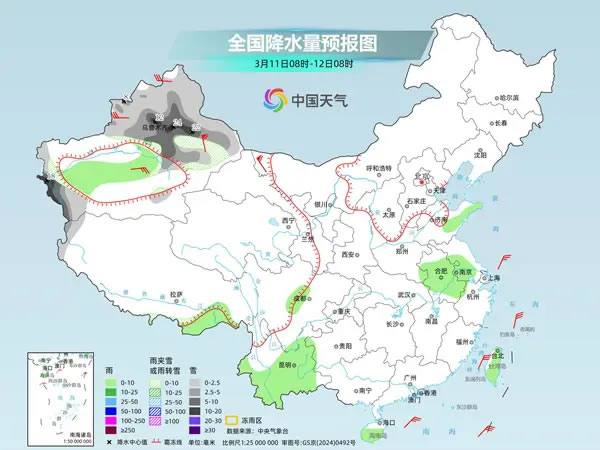 后天,內(nèi)蒙古東北部和中部、新疆沿天山地區(qū)和南疆山區(qū)、西藏西部和南部、甘肅大部、青海北部和東部等地部分地區(qū)有小到中雪或雨夾雪,其中,新疆東部和南疆山區(qū)等地部分地區(qū)有大到暴雪。新疆南疆盆地、西藏東南部、川西高原東部、陜西、四川盆地中西部、貴州西部、云南、臺灣島等地部分地區(qū)有小雨,局地有中雨。