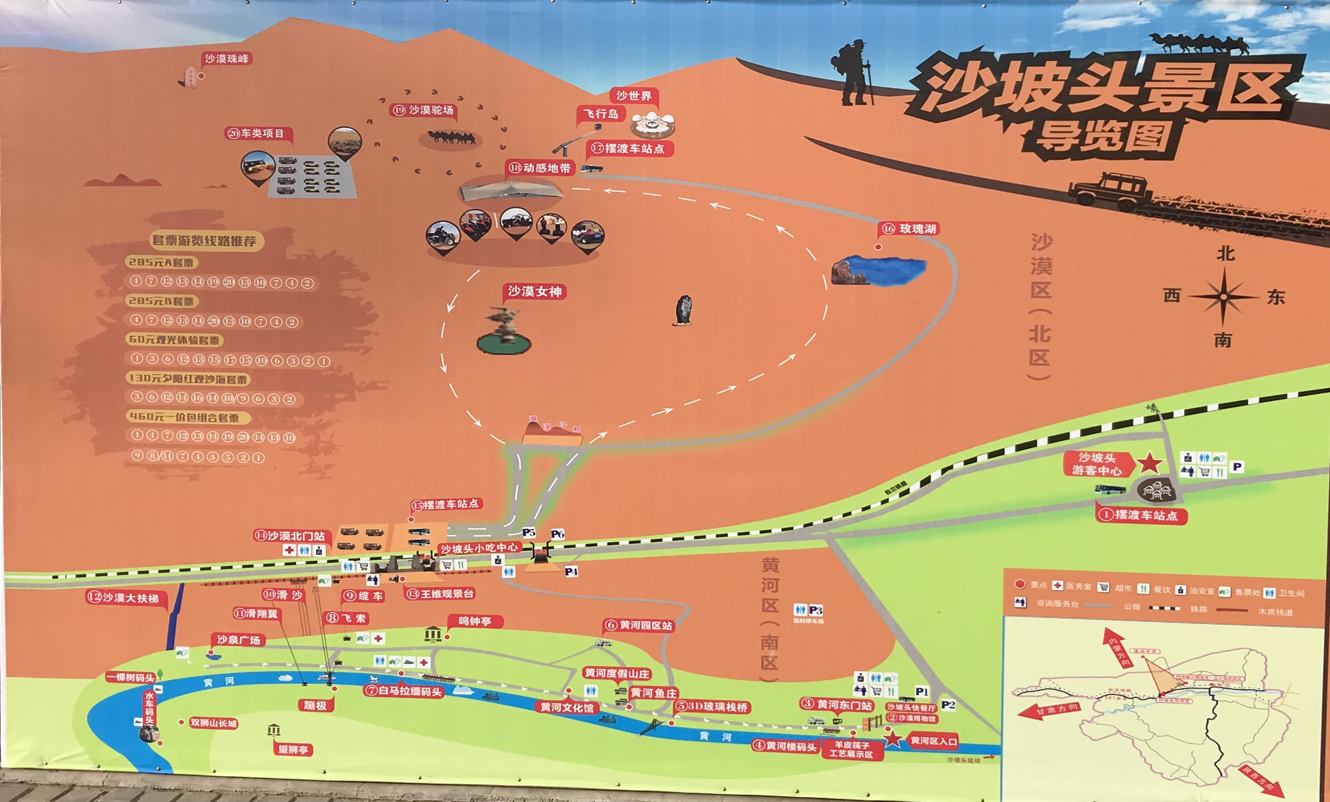 悠悠歲月,由古而今。天賜奇景與人們的不懈創(chuàng)造,使如今的沙坡頭已不是古時的沙陀頭,它融自然景觀、人文景觀、治沙成果于一體,被世人稱之為“世界沙都”、“世界壟斷性旅游資源”。在這里,“大漠孤煙直,長河落日圓”的古詩意境得到最完美的體現(xiàn);滑沙聽鐘,坡底戲泉,物我兩忘,其樂無窮;黃河弄筏,追波逐浪,驚險刺激;騎駝踏沙,體驗沙海輕舟之浩渺,觀大漠日落日出之壯美;觀星賞月,聽沙漠夜聲之神秘;圍篝火,飲酒吃肉,狂歌勁舞,大漠探險神秘引人;古老的河灣水車,輪轉(zhuǎn)水瀉,澆田灌園,別有情趣;沙下果園,疊翠流紅,鳥語花香,瓜甜果艷,令人流連忘返;“一線牽南北”的雙架索道,可實現(xiàn)凌空跨河比翼雙飛的夢想;古老的黃河木帆船、赤背的纖夫,將“妹妹你坐船頭,哥哥我岸上走”的歌曲變?yōu)楝F(xiàn)實美的享受;空中飛行、高空跳傘走出影視蒙太奇,飄落沙山;沙雕、沙療、沙浴和沙漠球類、沙漠田徑等形式多樣的“沙”字號體育健身競技項目,融智慧、趣味、知識、健身為一體;民族風(fēng)情演出、黃河梨花節(jié)、大漠黃河國際旅游節(jié),形式新穎,內(nèi)容獨特。將在5月4日舉行的大漠舞龍大賽,百余條巨龍在浩瀚的騰格里大漠騰滾翻飛,場面恢宏,氣勢雄偉,鑼鼓震天,令人心動……這,就是今日之全新的沙坡頭旅游區(qū),2000年被國家評定為AAAA級旅游區(qū),它是寧夏人之驕傲,是馳名中外的旅游勝地。