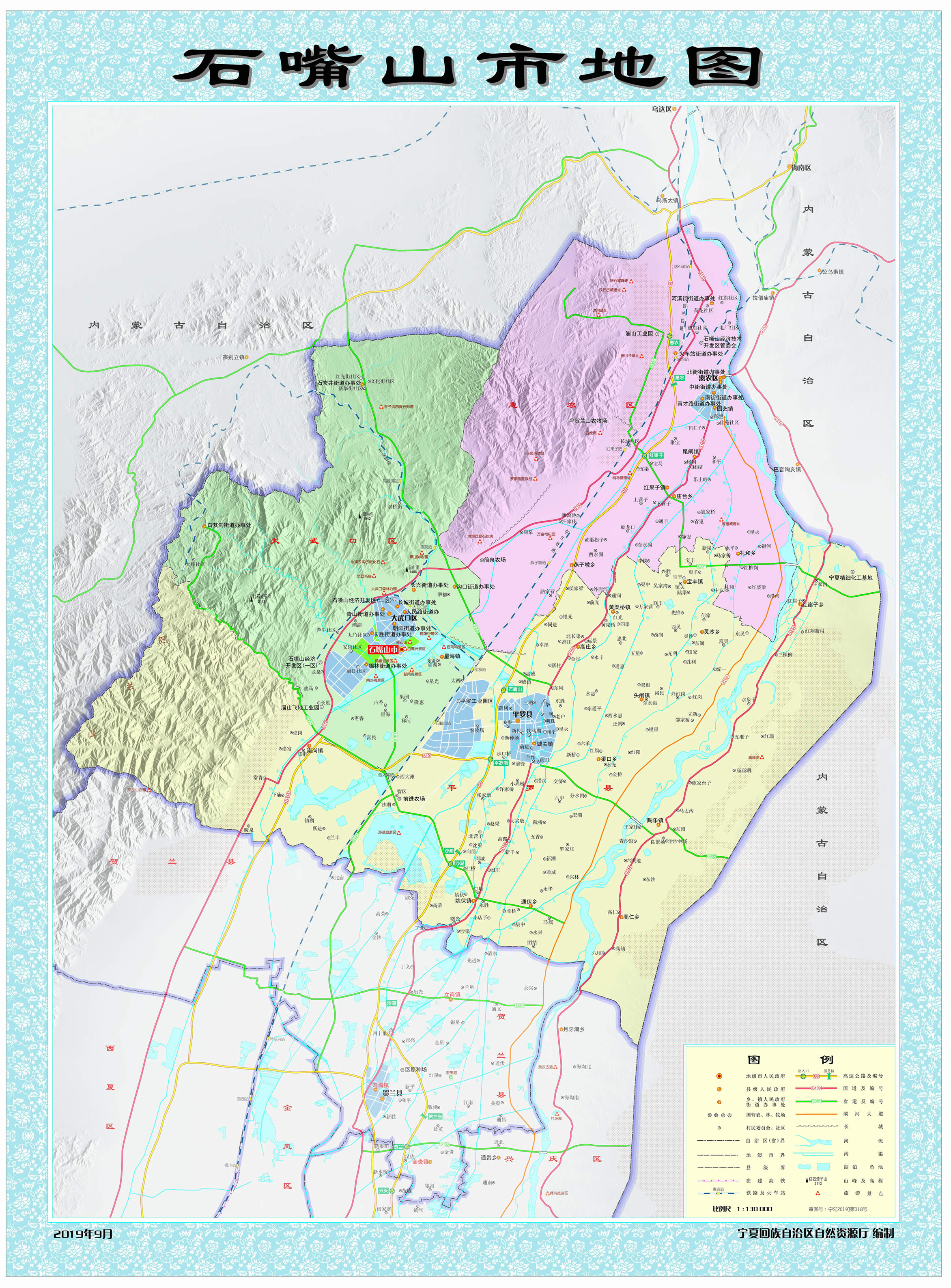 1975年11月23日,撤銷銀北地區(qū),恢復(fù)石嘴山市。石嘴山市因賀蘭山與黃河交匯處“山石突出如嘴”而得名,歷史悠久,秦朝時設(shè)渾懷障,西漢時設(shè)置第一個行政建制——廉縣,悠久歷史造就了厚重的文化底蘊,孕育了賀蘭山巖畫、古長城、北武當(dāng)壽佛寺、平羅玉皇閣、田州塔等人文古跡,擁有移民文化、賀蘭山文化、工業(yè)文化等民宿文化;地理位置較為優(yōu)越,地處寧東、蒙西兩個國家千億噸級煤田之間,是呼包銀蘭經(jīng)濟帶、寧夏沿黃經(jīng)濟區(qū)、寧蒙陜?yōu)踅鹑墙?jīng)濟區(qū)的重要節(jié)點城市;距銀川河?xùn)|機場100千米,包蘭鐵路、京藏高速、烏瑪高速、109國道、110國道等貫穿全境,被列為國家公路運輸樞紐城市、區(qū)域流通節(jié)點城市之一;黃河穿東過,西依賀蘭山,湖泊星羅棋布。市境內(nèi)有5A級旅游景區(qū)沙湖、國家水利風(fēng)景區(qū)星海湖等風(fēng)景名勝。