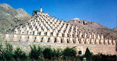 一百零八塔是中國現(xiàn)存的大型古塔群之一,位于銀川市南60公里的青銅峽水庫西岸崖壁下,塔群坐西面東,依山臨水,塔基下曾出土西夏文題記的帛書和佛禎,可能建于西夏時(shí)期是喇嘛式實(shí)心塔群。佛塔依山勢自上而下,按1、3、3、5、5、7、9、11、13、15、17、19的奇數(shù)排列成十二行,總計(jì)一百零八座,形成總體平面呈三角形的巨大塔群,因塔數(shù)而得名。