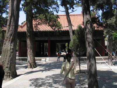 據(jù)《孟子》記載:“孟子曰:‘伯夷,圣之清者也;伊尹,圣之任者也;柳下惠,圣之和者也;孔子,圣之時(shí)者也!币馑际钦f,在圣人之中孔子是最適合時(shí)代的。據(jù)此,清世宗于雍正八年(1730年)欽定孔廟正門名“圣時(shí)門”。圣時(shí)門始建于明永樂十三年(1415年),3間,弘治年間擴(kuò)為5間中設(shè)拱門3 券,碧瓦歇山頂,四周是深紅的墻皮,券內(nèi)是杏黃的墻里,前后石階上各有石刻龍陛。由拱門內(nèi)望,令人有深邃莫測(cè)之感。