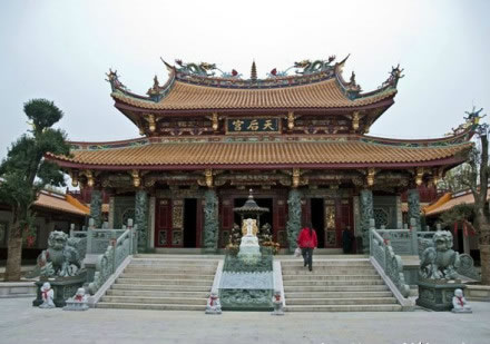 天后宮是天后圣母宮的簡(jiǎn)稱,它興修于雍正年間,祭祀海神林默。1938年,天后宮毀于臺(tái)兒莊大戰(zhàn)戰(zhàn)火。今天重建的天后宮,是我國(guó)內(nèi)地同類建筑中質(zhì)量標(biāo)準(zhǔn)最高的一座?偨ㄖ娣e1508平方米,為二進(jìn)庭院格局。由正殿、左右?guī)俊㈢姽臉堑冉ㄖ䴓?gòu)成。這座建筑,脊飾鏤空灰塑二龍戲珠,線條舒展流暢,木雕精美,彩繪點(diǎn)染,雕梁畫棟,金碧輝煌。