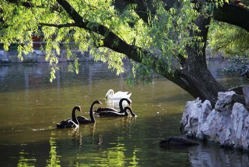 上海動(dòng)物園天鵝湖建于1954年,面積近3.3公頃(近50畝),是由幾個(gè)天然水塘開挖連成的,因首先飼養(yǎng)天鵝而得名,一座三孔橋南北橫跨。湖東一座琉璃綠瓦的四角亭,與西面鴛鴦榭遙遙相對(duì),臨水倚欄,觀賞水禽、飛鳥,尤其每天鵜鶘在上空盤旋,令人迷離神往。