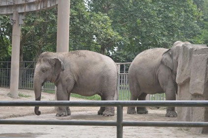 上海動(dòng)物園飼養(yǎng)有國(guó)內(nèi)動(dòng)物園少有的三代同堂的亞洲象家族。象展區(qū)包括象宮和象室外活動(dòng)場(chǎng)兩部分。象宮建成于1955年,是上海動(dòng)物園第一幢永久性的動(dòng)物館舍,總建筑面積1550平方米,主要包括500平方米室內(nèi)活動(dòng)場(chǎng)、620平方米參觀廳和100余平方米的4個(gè)門廳。室內(nèi)活動(dòng)場(chǎng)的東、西、南三面都是寬9米的參觀廳,參觀廳進(jìn)出口的門廳東、西各有一個(gè),南面分左右二個(gè),南面二門廳間外有紫藤棚架相連。整個(gè)建筑的門窗都用杉木拼雕成具有民族風(fēng)格的圖形裝飾。