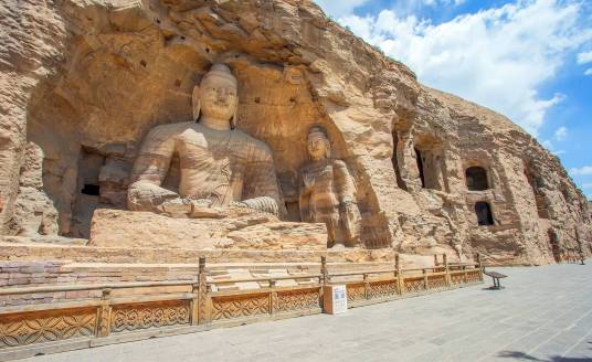云岡石窟,原名靈巖寺、石佛寺。位于山西省大同市西郊17公里處的武州山南麓,是中國著名的石窟群之一。云岡石窟的開鑿始于北魏時期,北魏皇始三年(398年),道武帝拓跋珪將都城從盛樂(今和林格爾縣)遷至平城(今大同市),武州山成為盛樂與平城之間的交通要沖。文成帝拓跋濬即位后,令沙門統(tǒng)曇曜主持復法大業(yè)。在文成帝的支持下,曇曜選擇了鐘靈毓秀的武州山,"鑿山石壁,開窟五所,鐫建佛像各一,高者七十尺,次六十尺,雕飾奇?zhèn),冠于一?quot;。云岡的大部分洞窟在孝文帝元宏遷都洛陽前完工,但是造像工程則一直延續(xù)到正光年間(520~525年)。云岡石窟的開鑿歷時約150年,歷經北魏、東魏、西魏、北齊、隋、唐等朝代,現存主要洞窟45個,大小窟龕252個,石雕造像59000余尊,是中國石窟藝術寶庫中的瑰寶。