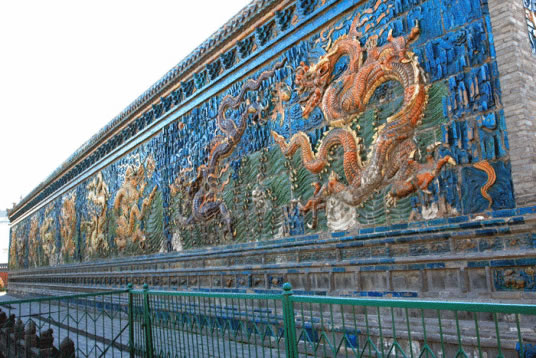 大同九龍壁坐南朝北,長45.5米、高8米、厚2.02米。全部使用黃、綠、藍、紫、黑、白等色琉璃構件拼砌而成。壁體由三部分組成:底部為須彌座,中部為壁身,上部為壁頂。第一層是麒麟、獅子、猛虎、梅鹿、飛馬等,第二層是行龍。壁前影池一方,長34米、深0.8米,石勾欄圍繞。池中清水如鏡,九條巨龍倒映池中。壁頂為單檐五脊,正脊為高浮雕的多層花瓣、花朵以及行龍等,脊獸俱全,兩側是雕刻的龍吻。
