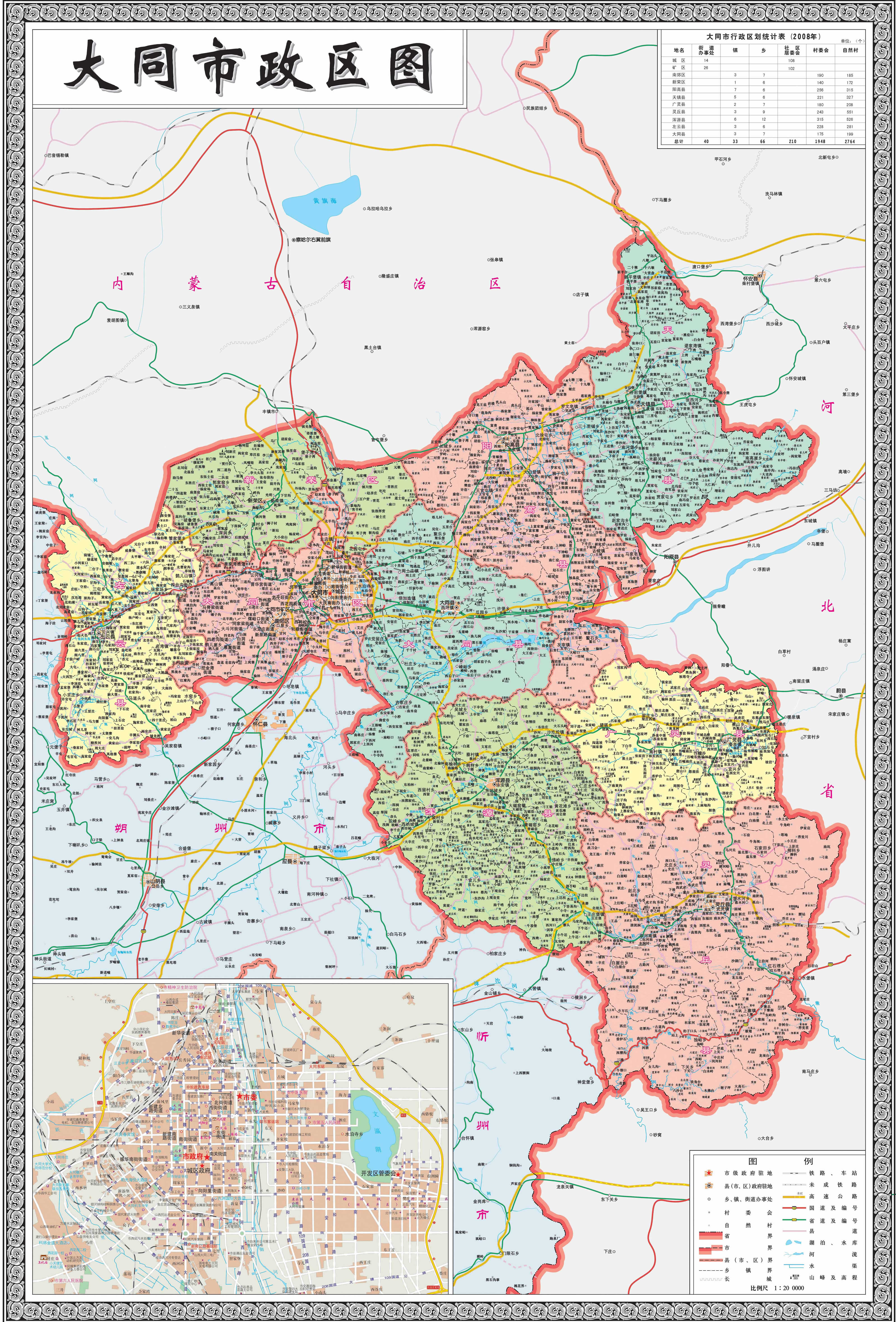 大同市位于山西省最北端,北以外長城為界,與內蒙古自治區(qū)烏蘭察布市的興和縣、豐鎮(zhèn)市、涼城縣毗鄰,西、南與本省朔州市的右玉縣、懷仁市、應縣及忻州市的繁峙縣相連,東與河北省張家口市的懷安縣、陽原縣、蔚縣及保定市的淶源縣、阜平縣接,公路里程距北京約330千米、太原約290千米、呼和浩特約300千米。大同市總面積14176平方千米,市區(qū)面積2080平方千米,建成區(qū)面積149.68平方千米。