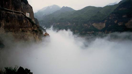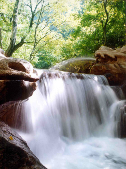 8、二十公里的水濤溝、蒼巖、曲徑、奇樹、怪石、山花、野草點綴其間,北魏酈道元《水經(jīng)注》所說的綿山 石桐水千回百轉(zhuǎn) ,湍湍流過,蒼鷹低回空谷鳥鳴,組成了一幅奇特的山水畫卷。其中的五龍飛瀑落差80余米,游人可從瀑下通過;水簾洞府瀑流從洞前飛流直下,洞內(nèi)可容納三四十人。這樣的風(fēng)光,在北方地區(qū)實屬罕見。