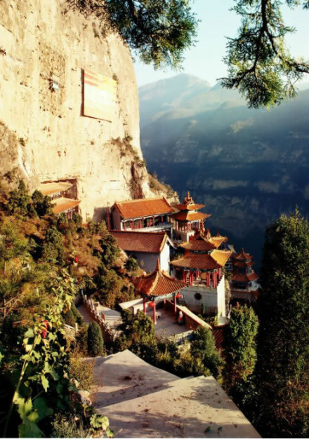 2、抱腹巖的山勢奇特為天下"絕無僅有"。它高60米,寬180米,深50米?梢员Ф儆嚅g殿宇館舍及一兩萬名游人于其中。驚險壯觀的巖下飛空掛鈴,更為一絕。