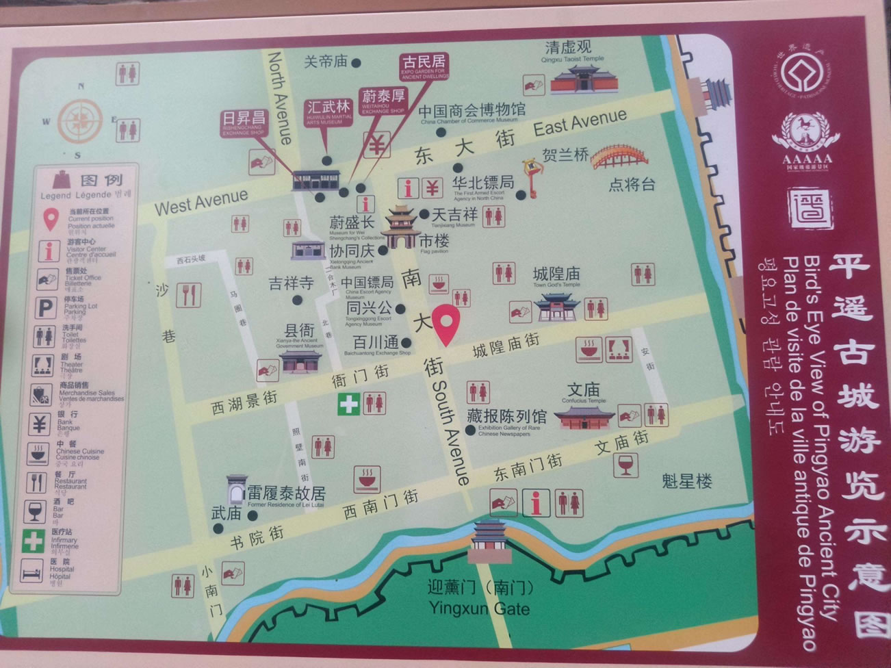 平遙古城素有“中國(guó)古建筑的薈萃和寶庫(kù)”之稱(chēng),文物古跡保存之多、品位之高實(shí)為國(guó)內(nèi)所罕見(jiàn)。其中有始建于西周,擴(kuò)建于明洪武3年(1370年),規(guī)模宏大,氣勢(shì)雄偉的國(guó)內(nèi)保存最完整的古城墻;有始建于北漢天會(huì)七年(963年)被列入我國(guó)第三位的現(xiàn)存最珍貴的木結(jié)構(gòu)建筑鎮(zhèn)國(guó)寺萬(wàn)佛殿。殿內(nèi)的五代彩塑堪稱(chēng)珍品,是研究中國(guó)早期彩塑的樣本;有始建于北齊武平二年(571年)、被譽(yù)為“中國(guó)古代彩塑藝術(shù)寶庫(kù)”,現(xiàn)存宋元明清彩塑2052尊的雙林寺;有中國(guó)宋金時(shí)期文廟的罕見(jiàn)實(shí)物——文廟大成殿;有中國(guó)金融上的開(kāi)山鼻祖,被譽(yù)為“天下第一號(hào)”、“匯通天下”的“日升昌”票號(hào);有始建于唐顯慶二年,國(guó)內(nèi)古建筑中罕見(jiàn)的“懸梁吊柱”奇特結(jié)構(gòu)清虛觀。觀內(nèi)20余尊木雕神像是研究中國(guó)古代木雕造像藝術(shù)和道教發(fā)展的稀有之物;有遍布古城內(nèi)外1000通碑刻及年代不一、形式多樣、色彩續(xù)紛的各種琉璃實(shí)物。同時(shí),平遙古城是中國(guó)古代民居建筑的薈萃中心之一。古城內(nèi)現(xiàn)存4000處古、近代民居建筑中,有400余處典型地體現(xiàn)著中國(guó)古、近代北方民居建筑的風(fēng)格和特點(diǎn)。