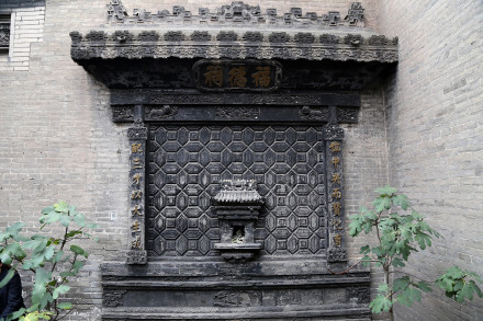 喬家大院大門坐西向東,為拱形門洞,上有高大的頂樓,頂樓正中懸掛著山西巡撫受慈禧太后面喻而贈送的匾額,上書“福種瑯環(huán)”四個大字。黑漆大門扇上裝有一對椒圖獸街大銅環(huán),并鑲嵌著銅底板對聯(lián)一付:“子孫賢,族將大;兄弟睦,家之肥!弊掷镄虚g透露著喬在中堂主人的希望和追求,也許正是遵循這樣的治家之道,喬在中堂經(jīng)過連續(xù)幾代人的努力,達(dá)到了后來人丁興旺、家資萬貫的輝煌。大門頂端正中嵌青石一塊,上書“古風(fēng)”。大門對面的掩壁上,刻有磚雕“百壽圖”,一字一個樣,字字有風(fēng)采。百壽圖為“在中堂”主人喬致庸的孫婿、近代著名學(xué)者、篆書家常贊春書寫。掩壁兩旁是清朝大臣左宗棠題贈的一付意味深長的篆體楹聯(lián):“損人欲以復(fù)天理,蓄道德而能文章!遍侯~是“履和”。甬道的西盡頭處是雕龍畫棟的喬氏祠堂,與大門遙相對應(yīng)。祠堂裝點得十分講究,三級臺階,廟宇結(jié)構(gòu),以獅子頭柱,漢白玉石雕,壽字扶欄,通天欞門木雕夾扇。出檐以四條柱子承頂,柱頭有玉樹交榮、蘭馨桂馥、藤羅繞松的鏤空木雕。額頭有匾,上書“仁周義溥”四字,李鴻章所題。祠堂里原陳列著木刻精雕的三層祖先牌位。