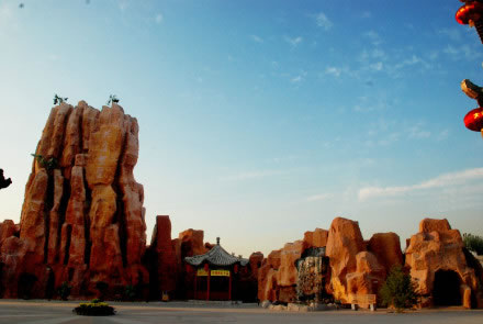 洪崖古洞建在這里與洪洞可是大有淵源的,因?yàn)楹槎催@個(gè)名字就是取自城南“洪崖”與城北“古洞”!昂檠聣q壁”與“古洞連云”這八個(gè)大字是由著名書法家董壽平書寫的!昂檠鹿哦础闭嫉孛娣e800平方米,南北長40米,東西寬20米,崖高16米,洞高4米,寬2.5米,洞內(nèi)蜿蜒曲折。