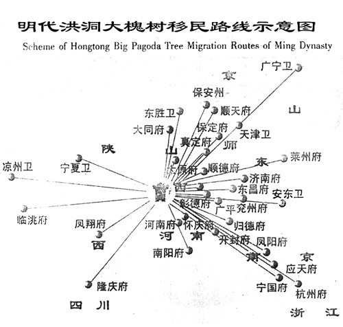 由于明朝大移民在山西省洪洞縣廣濟(jì)寺門前的大槐樹下進(jìn)行移民手續(xù)辦理,即移民的起點(diǎn),因此本次移民叫做洪洞大槐樹移民,而在此移民出去的人群,絕大多數(shù)并非洪洞縣人,甚至不是山西人。