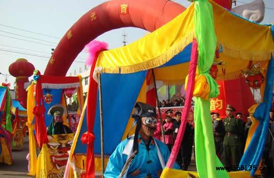 旱船:用竹條或木條制成船的模型,周圍用各色彩布遮蓋。表演者每人一船。以歷史或現(xiàn)代劇目為內(nèi)容,表演時(shí),一人在船前劃船引導(dǎo),數(shù)人在后駕船,翩翩起舞,并變換各種隊(duì)形表演。東寨的旱船表演最為壯觀。