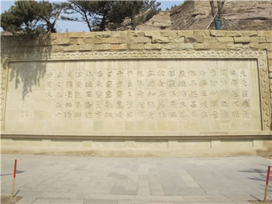 位于云岡石窟一窟山門前的“比丘尼曇媚造像記”石刻,為公元503年(景明四年)的題記。此碑刻有文字110個,再現(xiàn)了當(dāng)時的社會背景,表達了發(fā)愿人比丘尼曇媚對佛教的高度信仰與虔誠以及希望佛教振興發(fā)展的愿望,文筆優(yōu)美,堪稱佛教發(fā)愿文之最。此碑也向我們展示了北魏時期一種特有的字體。因這種字體在當(dāng)時多用于碑文,所以后人稱它為魏碑體。魏碑字體外方內(nèi)圓、拙樸有力,是隸書向楷書過渡的字體。由此看來,魏碑書法應(yīng)是北魏平城時的創(chuàng)造。原物很小,只有30厘米高,28厘米寬,于1956年20窟前考古發(fā)掘,現(xiàn)存于云岡博物館中。