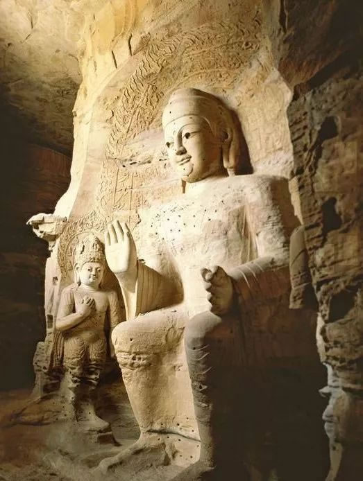 第19窟主佛像結(jié)跏趺坐,佛像耳輪齊肩,下頜崩毀,著袒右肩袈裟,輕薄貼體,衣紋簡潔明快。佛像右手舉胸施無畏印,左手掌心向上握法衣于膝上,以表達佛法的無畏與傳承。窟外東西耳洞中,各雕刻一尊倚坐佛像,西耳洞佛像,耳廓寬大垂肩,體魄挺拔勁健。這種分窟安置三世佛的布局設(shè)計,既有變化,又顯莊嚴,是北朝石窟形制的新創(chuàng)舉。
