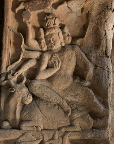 窟門拱頂正中雕一朵團蓮,四周飛天起舞。內(nèi)側(cè)上拱邊框為連續(xù)排列的忍冬葉,周圍雕伎樂天人。拱內(nèi)側(cè)壁分為上下層,下層為天王門神,逆發(fā)胡人形象,手持金剛杵或三叉戟。上層雕出多頭多臂神像,東壁雕三頭四臂,西壁雕三頭六臂。