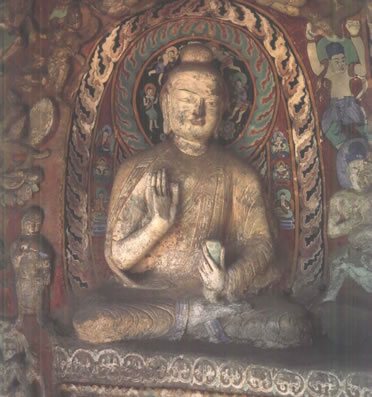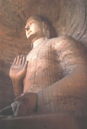 早期石窟:即今第16~20窟,亦稱為曇曜五窟。根據(jù)《魏書·釋老志》(卷114)記載:“和平初,師賢卒。曇耀代之,更名沙門統(tǒng)。初,曇耀于復(fù)法之明年,自中山被命赴京,值帝出,見于路,御馬前銜耀衣,時人以為馬識善人,帝后奉以師禮。曇曜白帝,於京城西武州塞,鑿山石壁,開窟五所,鐫建佛像各一,高者七十尺,次六十尺,雕飾奇?zhèn),冠于一世!蔽闹杏浭龅拈_窟五所,就是當(dāng)時著名的高僧曇曜就選擇了鐘靈毓秀的武州山,開鑿了雄偉壯觀的曇曜五窟,揭開了云岡石窟開鑿的序幕。第16~20窟即帝王象征的曇曜五窟,以造像的風(fēng)格和創(chuàng)作的技法來看,是云岡全窟群中最早的五個窟。平面為馬蹄形,穹隆頂,外壁滿雕千佛。主要造像為三世佛(過去、現(xiàn)在、未來),佛像高大,面相豐圓,高鼻深目,雙肩齊挺,顯示出一種勁健、渾厚、質(zhì)樸的造像作風(fēng)。其雕刻技藝繼承并發(fā)展了漢代的優(yōu)秀傳統(tǒng),吸收并融合了古印度犍陀羅、秣菟羅藝術(shù)的精華,創(chuàng)造出具有獨特的藝術(shù)風(fēng)格,這是中外融合所形成的新的藝術(shù)風(fēng)格。