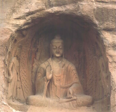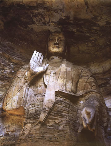 露天大佛高約13.7米,端坐于石臺座之上。佛首磨光肉髻,方圓面相,廣額豐頤,眉眼細長,鼻梁挺直,大耳垂肩;眉間施白毫,嘴唇略薄,唇上、下巴有八字胡須。眼中瞳孔為琉璃鑲嵌,大約是在遼代安裝。佛身挺拔壯碩,兩肩寬厚,著袒右肩式袈裟。袈裟質(zhì)地厚重,衣褶自然流暢,具有犍陀羅造像遺風(fēng)。大佛內(nèi)衣輕薄貼體,整體疏密得當(dāng),雕刻工藝精湛。大佛神情莊嚴,慈祥泰然,結(jié)跏趺坐,雙手于腹間相會疊加,呈禪定手印?上植颗c雙腿風(fēng)雨侵蝕,雕飾全無。但是大佛姿態(tài)雄偉,氣宇軒昂,生氣勃勃,融合東西方雕塑藝術(shù)于一體,是兼?zhèn)淞朔鹜印叭、八十種隨形好”的造像珍品。