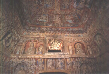 后室北壁頂部三角紋帶雕刻之下有上、下兩層大龕,下龕為圓拱龕,高4米,龕內(nèi)雕坐佛。上龕為盝形帷幕龕,龕內(nèi)中央為倚坐佛,兩側(cè)各有一交腳菩薩,最外兩側(cè)為思惟菩薩。龕楣十二格內(nèi)各雕一身飛天,龕楣上方雕有十四身伎樂天。