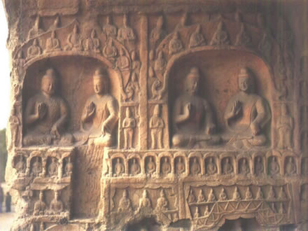 拱門高3.1米,寬2.25米。外側(cè)雕刻尖形門楣,內(nèi)飾忍冬紋。門外西側(cè)崩塌,經(jīng)近期修補,東側(cè)現(xiàn)存一力士,風(fēng)化嚴重。拱門西壁下部風(fēng)化嚴重。中部北側(cè)雕一圓拱龕,內(nèi)為坐佛。龕外兩側(cè)各雕一脅侍菩薩。龕楣內(nèi)雕七佛,龕兩側(cè)各雕五重千佛龕。中部南側(cè)雕一方形龕,內(nèi)為坐佛,龕外兩側(cè)各雕一脅侍菩薩。上層為方形帷幕龕,西壁雕坐佛坐于蓮座之上,兩側(cè)各雕一脅侍菩薩,南、北兩壁各雕一立佛,下雕蓮座。拱門東壁中、下部雕零散小龕,風(fēng)化嚴重。上部北側(cè)雕三層佛塔一座,塔下雕一圓拱龕,內(nèi)為坐佛。南側(cè)雕一盝形帷幕龕,內(nèi)為交腳菩薩,龕南側(cè)崩塌,F(xiàn)存北側(cè)一思惟菩薩與飛天。龕楣方格內(nèi)雕坐佛。 |