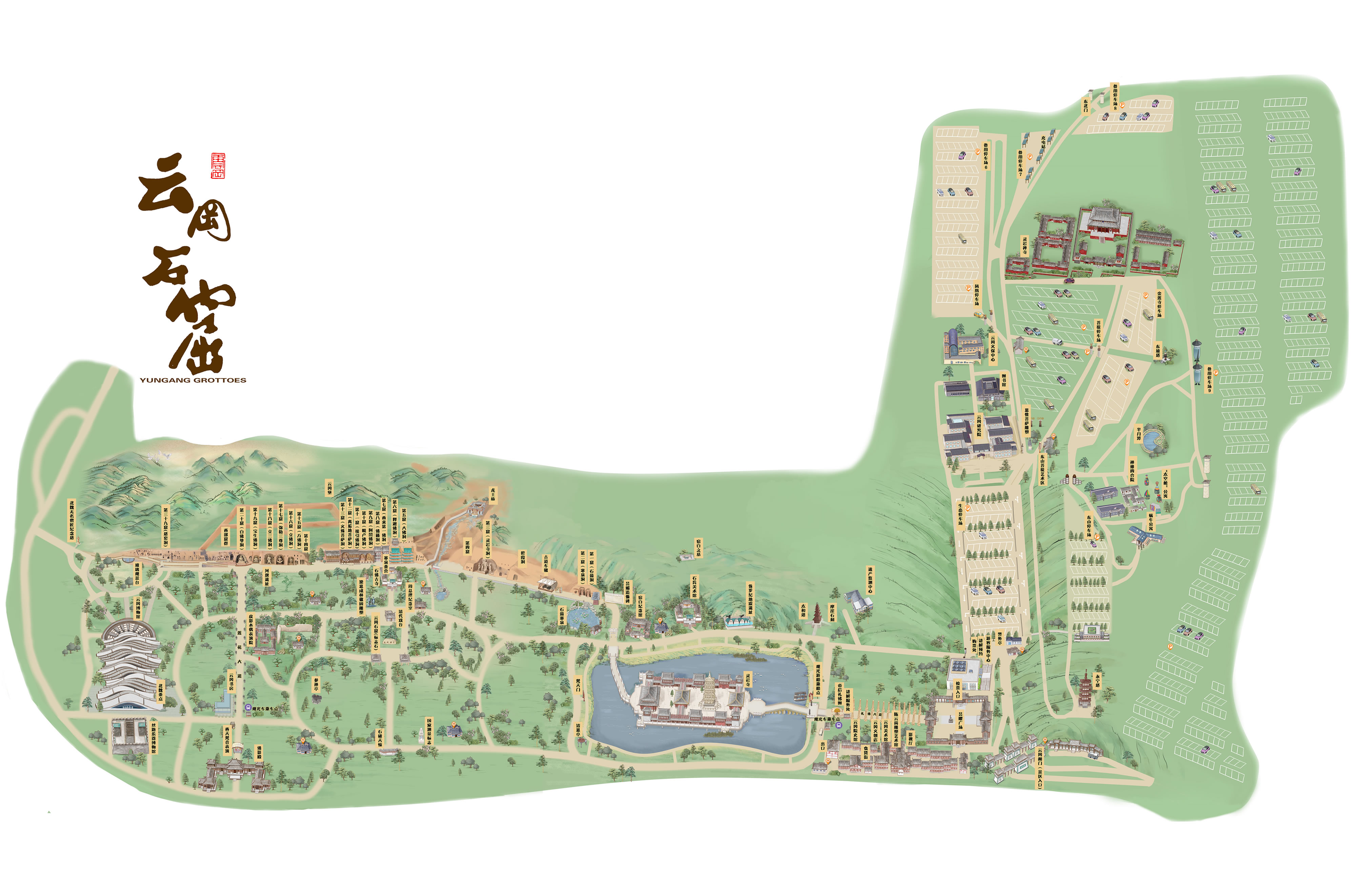 云岡石窟位于中國山西省大同市城西約16公里的武州(周)山南麓、武州川的北岸。石窟依山開鑿,規(guī);趾、氣勢雄渾,東西綿延約1公里,窟區(qū)自東而西依自然山勢分為東、中、西三區(qū),F(xiàn)存主要洞窟45個,附屬洞窟209個,雕刻面積達18000余平方米。造像最高為17米,最小為2厘米,佛龕約計1100多個,大小造像59000余尊。云岡石窟距今已有1500年的歷史,是佛教藝術(shù)東傳中國后,第一次由一個民族用一個朝代雕作而成皇家風(fēng)范的佛教藝術(shù)寶庫,是公元5世紀中西文化融合的歷史豐碑。1961年3月被國務(wù)院公布為首批全國重點文物保護單位;2001年12月被聯(lián)合國教科文組織批準列入“世界文化遺產(chǎn)”名錄;2007年5月成為國家首批5A級旅游景區(qū)。