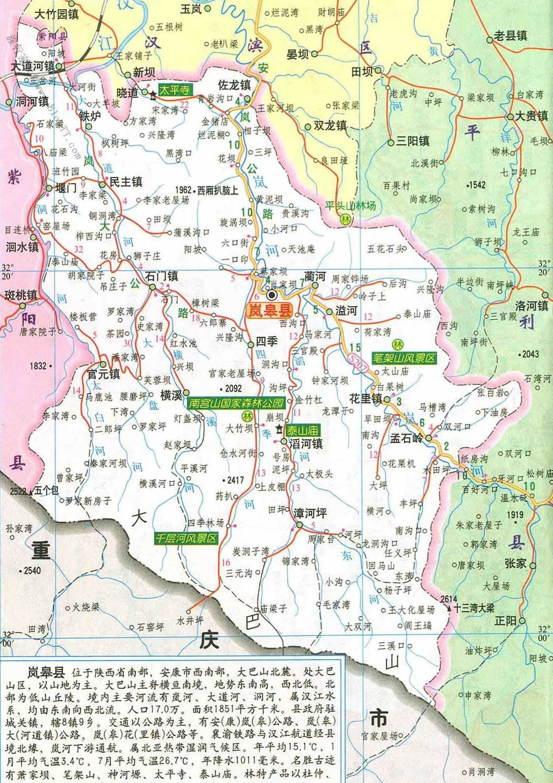 嵐皋縣位于陜西南部,大巴山北麓,南與重慶市城口縣接壤,北與安康市漢濱區(qū)、西與紫陽縣、東與平利縣相鄰,最高海拔2641米,最低海拔331米,北距安康市區(qū)71公里,全縣轄17個鄉(xiāng)鎮(zhèn)198個行政村,4.4萬戶,全縣總面積1956平方公里,人口17萬。其中農(nóng)業(yè)人口15.2萬人,境內(nèi)以山地為主,屬典型的亞熱帶大陸性季風(fēng)氣候。