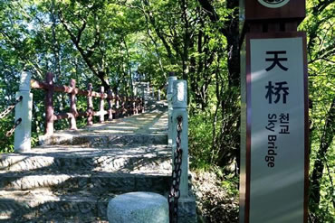 云霧天橋是由泥土和山石天然堆砌生就而成的。它坐落在云霧山鬼谷嶺南麓一條山脊上,地處三天門到四天門之間。這里海拔近2000米,在天際的白云中飄浮,所以稱它為云霧天橋。此橋其實(shí)就是一條短短的山脊,長約20余米,寬不足1米,僅容一人通過。