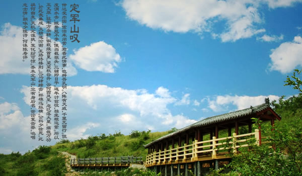 定軍山:定軍山位于陜西省漢中市勉縣城南5千米,三國時(shí)期古戰(zhàn)場。為省級風(fēng)景名勝區(qū)。原屬武侯墓鄉(xiāng),今屬定軍山鎮(zhèn)轄區(qū)。三國時(shí),蜀將黃忠斬夏侯淵、趙顒?dòng)诖,在歷史上遂負(fù)盛名。屬大巴山脈,其脈自高廟子入平地,隆起秀峰12座,自石山子至元山子,號稱“十二連峰”,再東為當(dāng)口寺孤峰,自西向東綿延十多公里,如游龍戲珠,故有“十二連山一顆珠”之譽(yù)。主峰定軍山為最高處,海拔833米,山頂原有“古定軍山”石碑,文革被毀,今新立。山南有一個(gè)天然鍋底形的大洼,周長1.5千米,即三國時(shí)稱為“可屯萬兵”的“仰天洼”。北麓有一片廣漠沃野,就是當(dāng)年諸葛亮大布“八陣圖”、設(shè)“督軍壇”的武侯坪,黃忠大戰(zhàn)夏侯淵的戰(zhàn)場,時(shí)常發(fā)現(xiàn)“扎馬釘”和箭鏃,傳為蜀軍用兵之物;山旁有“斬將橋”,“八角琉璃井”井口八角形,薄頁細(xì)花紋漢磚砌成,皆不存。山半腰有一大石,高約3.3米,寬約2米,中開一縫,寬窄不一,名曰“擋箭牌”,傳為諸葛亮遮擋敵箭的遺物。