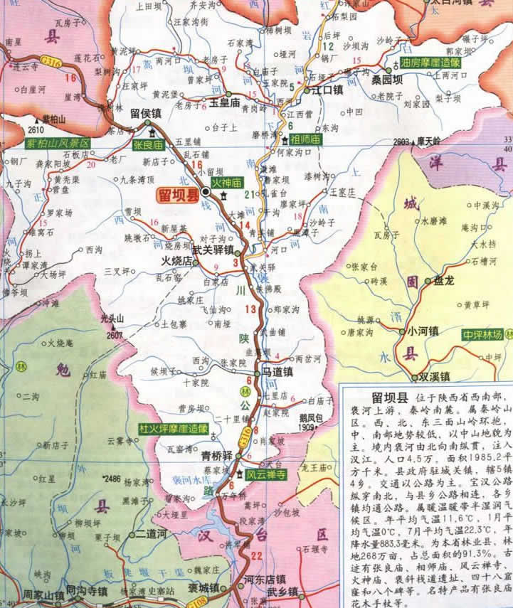 留壩縣地處陜西省西南,漢中市北部,東連洋縣、城固,南接漢臺(tái),西鄰勉縣,北靠太白、鳳縣 。東經(jīng)106°38′05〞-107°18′14〞,北緯33°17′42〞-33°53′29〞。全縣總面積 1958 平方公里 , 東西長(zhǎng) 46.4 公里,南北寬 67.2 公里。距西安 367 公里 ,距漢中 85 公里。
