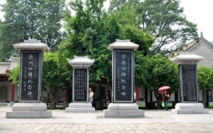 碑亭西前方,矗立著四塊石碑:香港回歸紀(jì)念碑、澳門(mén)回歸紀(jì)念碑、“臺(tái)灣光復(fù)致敬團(tuán)”祭黃帝陵文碑、慶祝香港回歸祖國(guó)十周年黃陵謁祖祭文碑。
