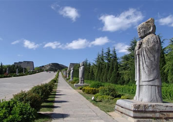 從梁山南二峰的天然雙闕起,往北依次對稱排列。端立首位的是1對高達8米有余的八棱柱石華表,這是帝王陵墓的標志,其造型昭示著生命長存的理念和古代先民對人類生殖行為的崇拜。接著是一對昂首挺胸、渾圓壯觀的石刻翼馬,馬身兩翼雕以卷云紋,似有騰飛之勢。翼馬之北是1對優(yōu)美的高浮雕鴕鳥,是唐王朝同西域人民文化交流與友好往來的象征。緊接鴕鳥的是5對配有馭手的石仗馬和10對高4米左右的石翁仲(或稱直閣將軍)。